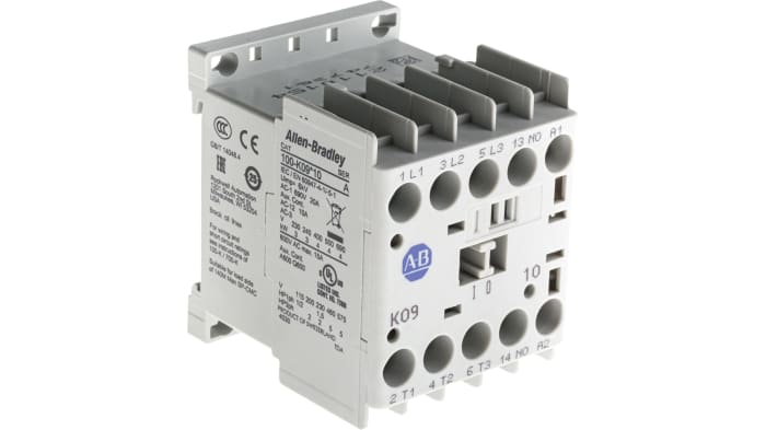 Allen-Bradley Bulletin 100-K miniature contactors are designed for commercial and light industrial applications where panel space is at a premium. These miniature devices, while 45 mm wide, are shallower and have less panel depth requirements than standard IEC contactors.The miniature contactors have been designed with flexibility in mind. They are available with AC or DC operating coils, several contact ratings. Optional 2- or 4-pole auxiliary contact blocks in a variety of auxiliary contact configurations are available separately.