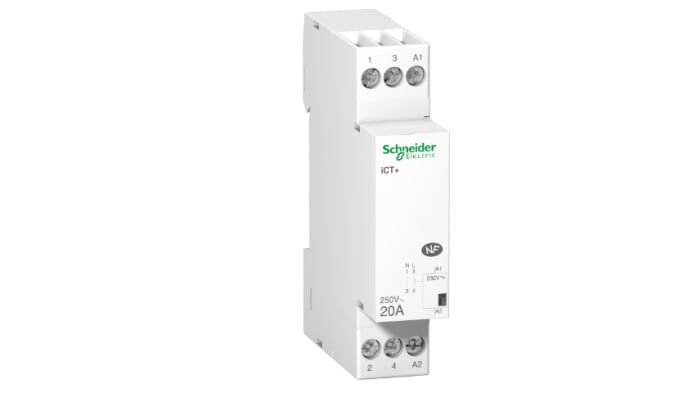 The Schneider Electric Acti9 iCT+ is a low voltage silent modular contactor. It is a 1P remote control device with 1 normally open contact. The rated current is 20A for AC-7a and 20A for AC-7b. The Ue rated operational voltage is 250VAC.