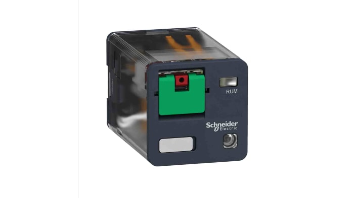 The Schneider electric range zelio RUM of universal plug-in relay on base, Spring return lockable test button for testing contacts A mechanical indication of relay status No adjustments required for standard operation Socket to be ordered separately. Supply voltage is 24Vac and current is 10A.Relays are electrical switches that are operated by electrical impulses with the primary function to open and close a circuit, they can also be referred to as industrial switches.