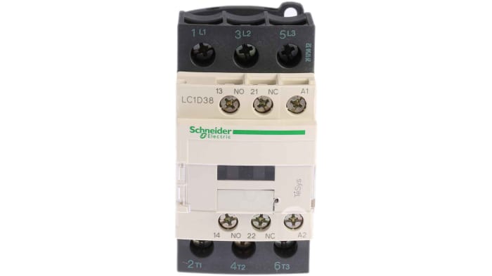 The Schneider Electric LC1D38B7 model is a 3 pole contactor featuring a 24 V ac operating coil, with an AC-3 full load current rating of 38 A.