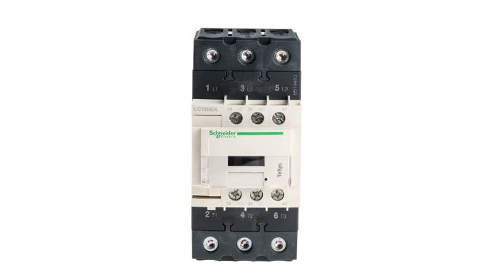 The Schneider Electric LC1D50AU7 model is a 3 pole contactor featuring a 240 V ac operating coil, with an AC-3 full load current rating of 50 A