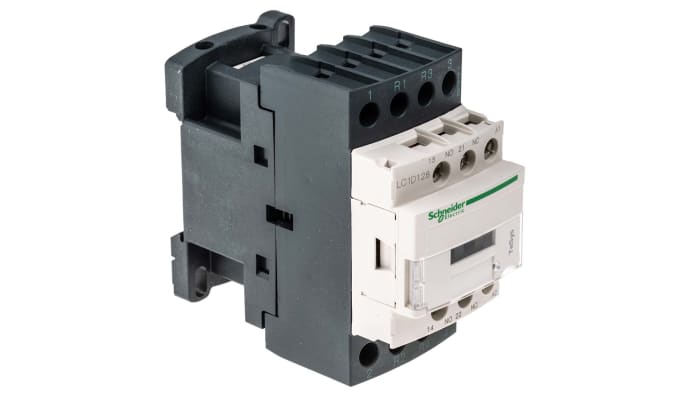 The Schneider Electric LC1D128F7 model is a 4 pole contactor featuring a 110 V ac operating coil, with an AC-3 full load current rating of 12 A.