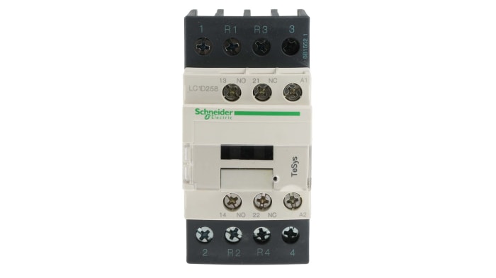 The Schneider Electric LC1D258F7 model is a 4 pole contactor featuring a 110 V ac operating coil, with an AC-3 full load current rating of 40 A.