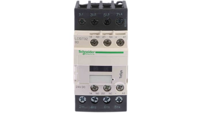 The Schneider Electric LC1DT32BD model is a 4 pole contactor featuring a 24 V dc operating coil, with an AC-3 full load current rating of 32 A