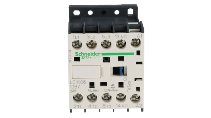 The LC1K0610B7 is a miniature 3 pole contactor featuring a 24 V ac operating coil, an AC-3 full load current of 6 A and a normally open auxiliary contact.