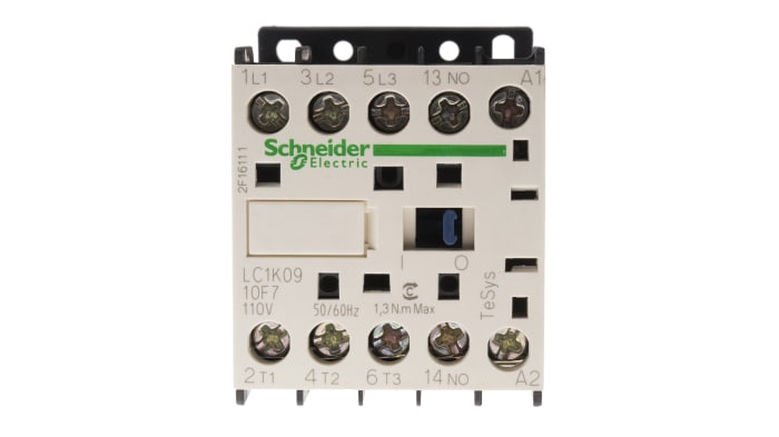 The LC1K0910F7 is a miniature 3 pole contactor featuring a 110 V ac operating coil, an AC-3 full load current of 9 A and a normally open auxiliary contact.