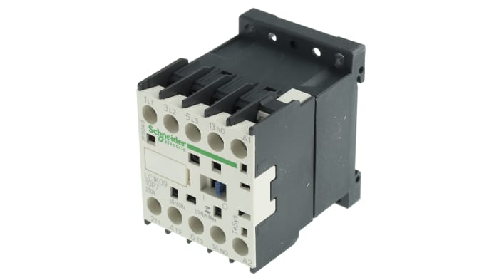 The LC1K0910P7 is a miniature 3 pole contactor featuring a 230 V ac operating coil, an AC-3 full load current of 9 A and a normally open auxiliary contact.