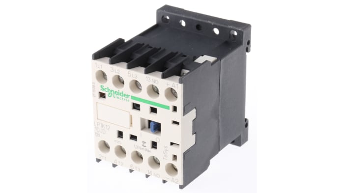 The LP1K1210JD is a miniature 3 pole contactor featuring a 12 V dc operating coil, an AC-3 full load current of 12 A and a normally open auxiliary contact.