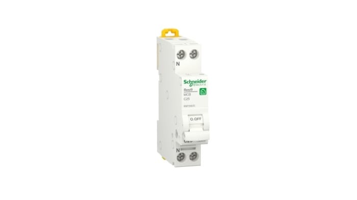 The Schneider Electric miniature circuit breaker Resi9 has 1 pole and its current rating is 25 A. It used C type of curve code and it compliant with standards such as IEC/EN 60898. Its colour is white and it used DIN rail mounting. Its neutral position is left.