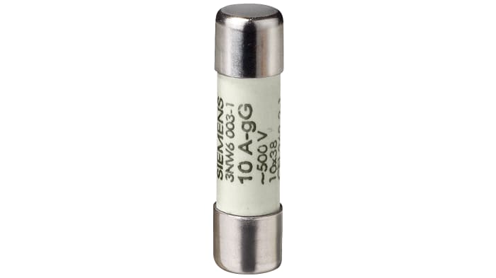 The Siemens SENTRON cylindrical fuse link, with operational current 12A and supply voltage 500V, has size of 10×38 mm.