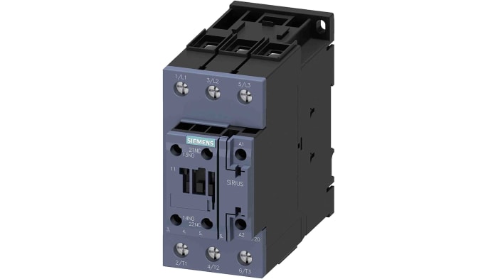 The Siemens 3RT2 series SIRIUS range 24V/50A power contactor with three poles. It has electrical connection of the screw terminal type for main current circuit and for auxiliary and control current circuit.