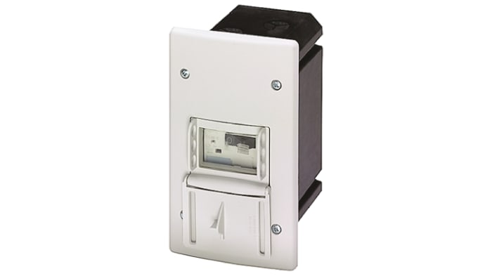A Siemens range of enclosures, equipped with N and PE/ground terminals, for installing circuit breakers as a single unit. There are two knock-out cable entries for cable glands at the top and two at the bottom of the enclosure, with scored cable entries at the rear. A knock-out on the top of the enclosure is provided for indicator lights.