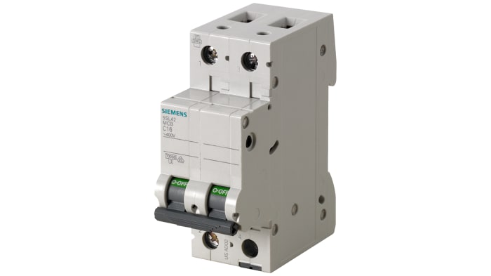 The Siemens 5SL4 series two-pole miniature circuit breaker has a current rating of 8 A and 10 kA breaking capacity. The miniature circuit breaker is the fuse for short-circuit protection. Siemens offers a comprehensive portfolio of protection, switching, measuring and monitoring devices, distribution systems as well as switches and sockets for safe and efficient electrical infrastructure in buildings and industry.